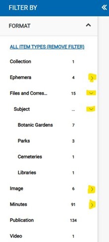 Format is the most useful option – allows to filter to item types, eg photo, video, minutes etc. The menu also offers the option to drill down further into the metadata by opening the subfilters. For example, if we wanted to see a file that had information about the Tropical Dome (the search term) and Botanic Gardens (a subject of an item) in general, there are 7 results available after selecting the subfilters: