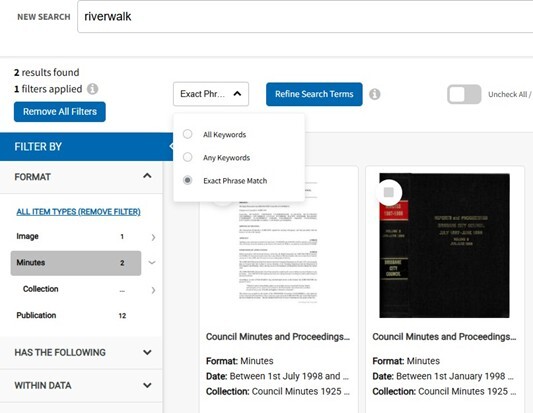 Please note that the search is “fuzzy” – meaning that like a search engine, it will attempt to correct typos or find similar words or terms. For example, Queen St will pull up Queen Street and vice versa. This can be a little overzealous, and may do things like display results for "Alderley" along with "Annerley". It does not obey Boolean functions like AND, OR, NOT, please use Defined Search (above) or the Refine Search Terms button for this functionality, shown below: