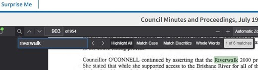Many items in the collection are text-heavy, such as minutes, reports and publications. One of the features of our website is the ability to search within text-based documents. Let’s try to find the first mention of the Riverwalk in the Council Minutes.
