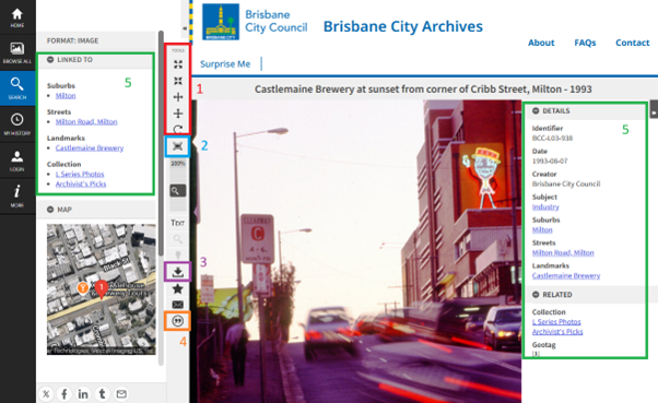 The panels labelled #5 in green is the metadata – details about the item. Each hyperlinked line of text will link to similar items. For example, clicking on Milton will take you to a page that collects everything relevant to Milton. This is a great way to navigate the website as it allows you to organically explore – it’s like browsing Wikipedia.